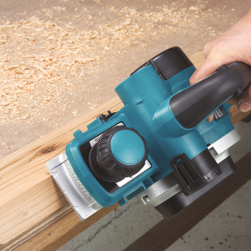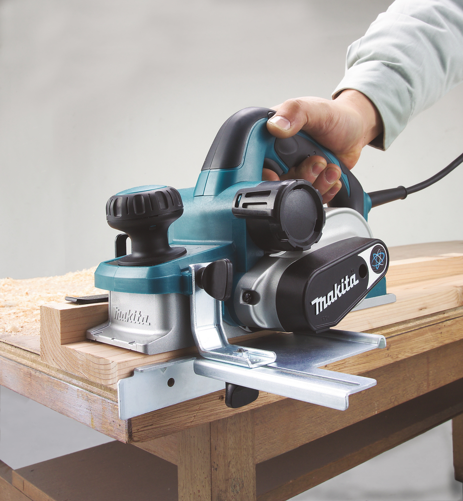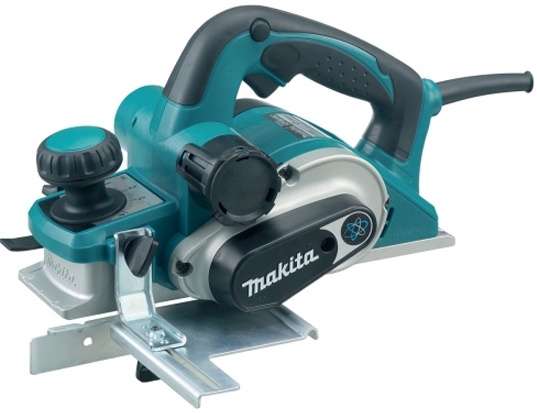 Передняя рукоятка электрического рубанка Makita KP 0810 совмещена с механизмом регулировки глубины строгания.