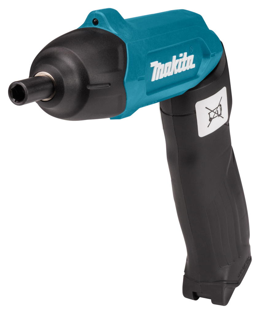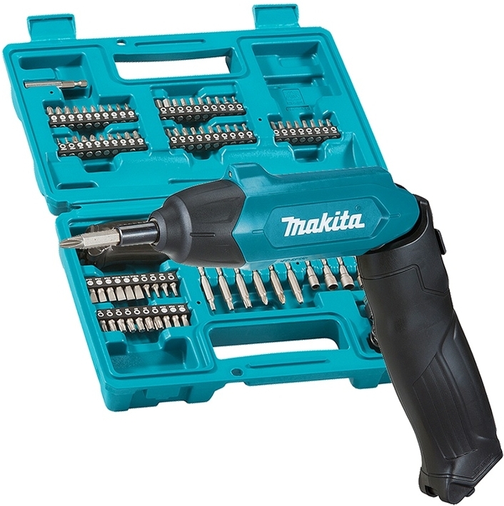 Модель Makita DF001DW – аккумуляторная отвертка, предназначенная для закручивания крепежных элементов. Отлично подойдет и для сверления отверстий: в древесине диаметром до 6 мм, в стали – до 5 мм. Максимальное затягивающее усилие – 6 Нм. Улучшенный шарнирный механизм позволяет работать с инструментом как в прямом, так и в пистолетном положении. Инструмент оснащен противоскользящей обрезиненной рукояткой, обеспечивая крепкий захват. Магнитный держатель бит и большой набор оснастки из 81 предмета в комплекте делают эту отвертку многофункциональной. Источник питания – литий-ионный аккумулятор напряжением 3.6 Вт. Оснащен встроенным аккумулятором на 1,5 Ач, зарядка через USB-кабель. Компактна и легка, вес инструмента составляет всего 360 грамм.